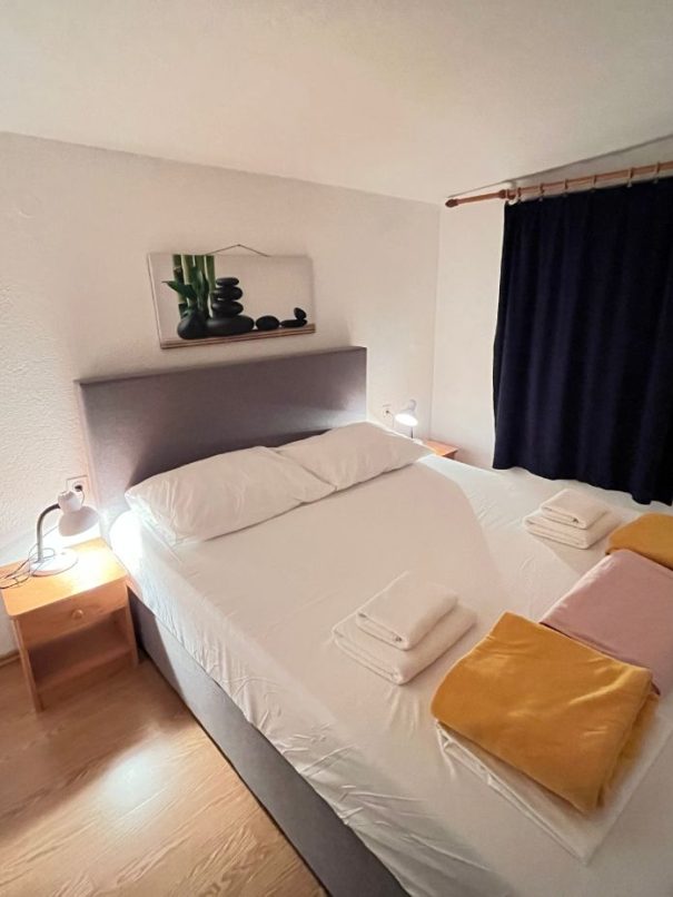- Dve spalnici, ena z zakonsko posteljo, druga z dvema enojnima posteljama, s posteljnino